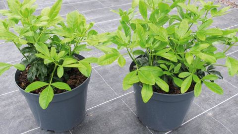 Choisya en conteneur de 7 l quelques mois après le rempotage. À gauche : plante issue de trois boutures dans une motte intermédiaire de 5 cm et rempotage d'une seule motte. À droite, plante issue de trois petites mottes directement dans le pot au rempotage pour remplacer un pré-conteneur de 2 l. PHOTO : VALÉRIE VIDRIL
