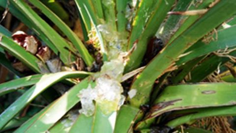 La larve de Batrachedra enormis provoque l'excrétion de gomme à la base de la plante hôte. PHOTO : ÉRIC CHAPIN, COSAVE