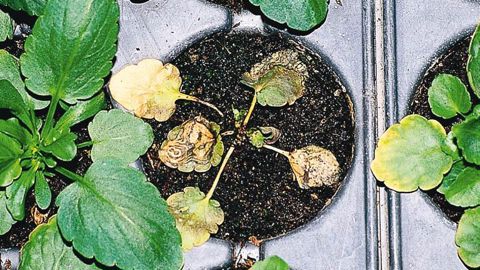 La pensée hybride redoute l'hydromorphie au niveau de la motte. Une confusion est donc possible avec une asphyxie racinaire due à un excès d'eau. Dans ce cas, seule la cause abiotique est retenue. Mais il existe très souvent une relation de cause à effet entre l'humidité élevée du substrat et le développement de Thielaviopsis basicola. D'autres champignons du sol comme Fusarium sp., Phytophthora sp., Pythium sp. ou Rhizoctonia solani peuvent être à l'origine du dépérissement racinaire de la pensée. Mais Thielaviopsis basicola est certainement le seul à provoquer, de façon aussi nette, une zone de rupture au niveau du collet. Lorsque l'on tire sur le plant, il se sépare facilement de la partie souterraine. Cependant, une analyse en laboratoire est recommandée pour identifier l'agent causal avec certitude.