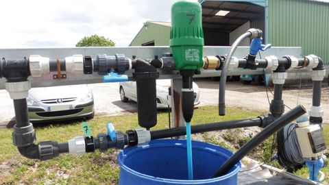 Il est important de toujours procéder à un rinçage de la partie aspiration de la pompe doseuse avec de l'eau claire pour diluer le produit aspiré et laver les pièces en contact avec celui-ci. PHOTO : J.-L. LAUNOIS