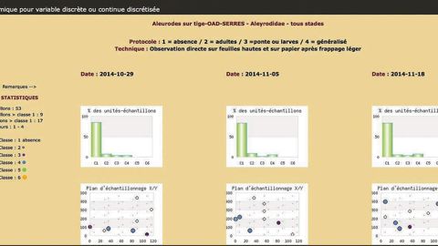 Les outils télématiques du projet OAD Serres ont été développés en 2012 à partir de ceux mis au point en interne par l'Inra Sophia Antipolis, qui a commencé à travailler sur le sujet dès 2002. Une plate-forme gérée par l'institut de recherche (Sophi@datamarket ou S@M, en ligne sur http://sam.sophia.inra.fr/sam/index_courant.html) rend disponible, à tout moment et n'importe où, l'accès aux outils (logiciels de saisie, d'interprétation, de modélisation) et aux informations enregistrées. Sur la parcelle, le producteur ou l'expérimentateur saisit ses notations directement sur tablette (en mode connexion ou hors-ligne), ou a posteriori sur ordinateur. Les données sont centralisées sur la base de S@M. Les variables enregistrées (jusqu'à vingt-neuf selon l'équipement de l'exploitation) sont agronomiques (stades de culture, longueur de tige...), épidémiologiques (ravageurs, maladies, auxiliaires), abiotiques (température, hygrométrie) et peuvent aussi intégrer les interventions (gestion de la serre, traitements chimiques et biologiques). À partir de ces enregistrements, S@M fournit des tendances de risque épidémiologique pour chaque bioagresseur. Le producteur peut visualiser la dynamique des populations (utiles et nuisibles) semaine après semaine, et ainsi déclencher les interventions en temps voulu. La représentation graphique proposée est non seulement temporelle mais également spatiale. « L'OAD ne fournit pas de proposition de traitement », précise Christine Poncet, directrice adjointe de l'Institut Sophia Agrobiotech. « Il ne remplace pas le producteur dans la prise de décision. » Elle ajoute : « La plate-forme ne travaille pas avec des seuils d'intervention. Avec cette notion, on bannit en effet les spécificités d'une production. Un seuil peut être plus ou moins bas selon l'ambiance de la serre et les dynamiques de population qu'elle induit (croissance rapide ou lente). C'est au producteur de fixer éventuellement des seuils, parce qu'il connaît son exploitation. »