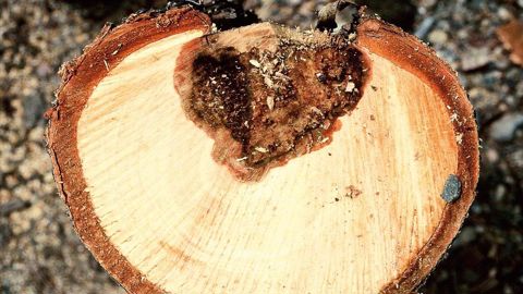 Le champignon entraîne une pourriture plutôt spongieuse de l'aubier.