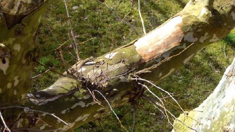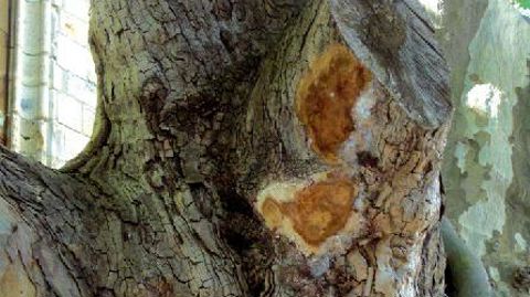 Lésion corticale sur la face supérieure d'une charpentière horizontale occasionnée par Massaria platani.