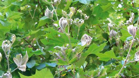 Jeunes feuilles et pousses racornies couvertes d'un fin feutrage blanc caractéristique de l'oïdium.