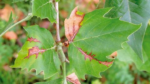Nécroses nervaires de forme angulaire occasionnées par l'anthracnose du platane.