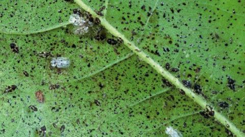 Au revers d'une feuille mouchetée de déjections noires luisantes, larves et adultes du tigre du platane.