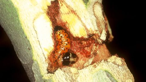 Chenille de la zeuzère du poirier creusant sa galerie dans la zone sous-corticale d'une branche de platane.