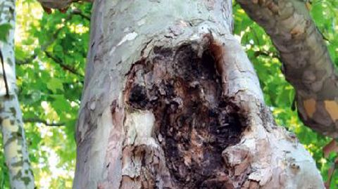 Coloration violacée remontant en « flamme » sur le tronc d'un platane contaminé par Ceratocystis platani à partir de son système racinaire.