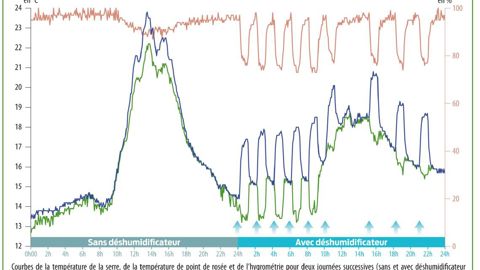 Elles se traduisent par un confinement plus important des serres. On accroît alors les risques d'excès d'hygrométrie, et donc les risques phytosanitaires et de manque de qualité. Ces risques ne sont pas à négliger en zone océanique entre octobre et mars. Ils sont moins systématiques en région méditerranéenne. Or, la lutte contre les excès d'hygrométrie par la technique classique qui associe chauffage et aération est très énergivore. Pour maximiser les économies d'énergie, le Cate (Astredhor Loire-Bretagne) et le Scradh (Astredhor Méditerranée) se sont demandés s'il était possible de recourir à une gestion découplée des températures et de l'hygrométrie en utilisant les déshumidificateurs thermodynamiques. Ces appareils sont équipés d'un groupe frigorifique. L'air à traiter traverse un échangeur froid sur lequel la vapeur d'eau se condense. Puis l'air refroidi est réchauffé par passage sur le condenseur avant sa réinjection dans la serre.