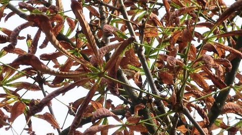 La sectorisation architecturale dans l'expression des symptômes relevée sur des arbres de cette génération laisse envisager une possible intoxication d'un polluant par voie racinaire. De tels signes apparaissent notamment en cas d'une absorption accidentelle d'un phytocide par un nombre limité de racines ; les signes d'intoxication par le produit ne s'observent alors que sur quelques axes dans le houppier. Les colorations corticales suspectes expriment un dépérissement des tissus cambiaux. Le dessèchement du rhytidome signifie leur mortalité. La présence d'un cal de cicatrisation autour des tissus nécrosés indique une réaction de l'arbre et une tentative de recouvrement des zones endommagées. L'apparition des symptômes foliaires lors des premières chaleurs printanières et leur aspect (une nécrose marginale et internervaire) est assez caractéristique de l'expression d'un important stress hydrique mais ici, un manque d'eau ne peut pas objectivement être mis en cause. Sur cette essence, une sécheresse induite par la présence d'un polluant minéral est donc envisagée. Pour l'identifier, des analyses minérales ont été réalisées à partir d'échantillons de feuilles, de rameaux et de branches ; elles ont mis en évidence des teneurs élevées en chlore (Cl) et en sodium (Na). L'intoxication des arbres par du sel (NaCl) résultant d'un épandage au sol est confirmée.
