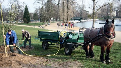 L'arrosage des jeunes arbres nouvellement plantés, au lac Daumesnil, dans le bois de Vincennes (94), s'effectue à l'aide d'une remorque hippomobile. PHOTO : VILLE DE PARIS
