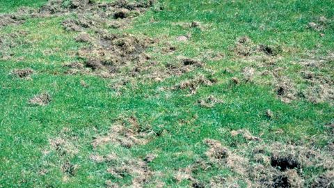 Gazon infestépar des larvesde scarabéesjaponais, que des mammifères déterrent pour manger. PHOTO : M.G. KLEIN, USDA