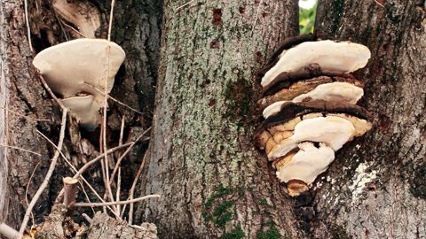 Carpophores du ganoderme européen développés au niveau de fourches à écorce incluse sur un tilleul argenté. PIERRE AVERSENQ