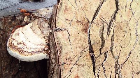 Le schizophylle commun, spécialisé dans la dégradation du bois d'aubier, s'installe souvent à la suite d'une échaudure corticale ou d'une blessure d'écorçage.
