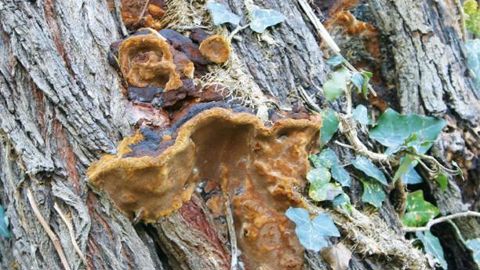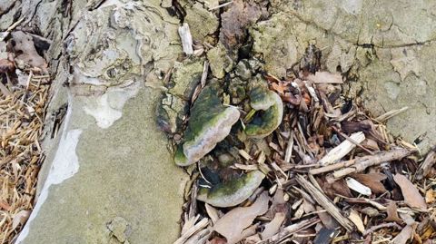 Larges consoles du phellin à bourrelet au pied d'un févier d'Amérique (Gleditsia triacanthos) sans altération significative du bois profond.