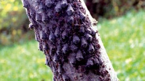Colonie du grand puceron du saule (Tuberolachnus salignus) à la base d'un jeune tronc.