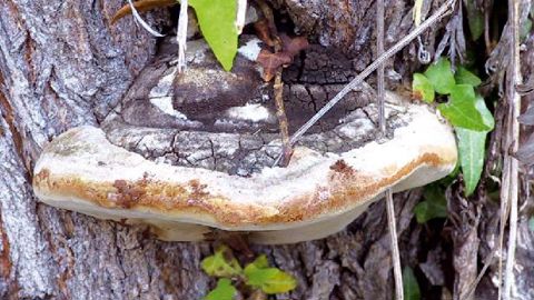 Console coriace et pluriannuelle du faux amadouvier (Phellinus ignarius) sur le tronc d'un vieux Salix.