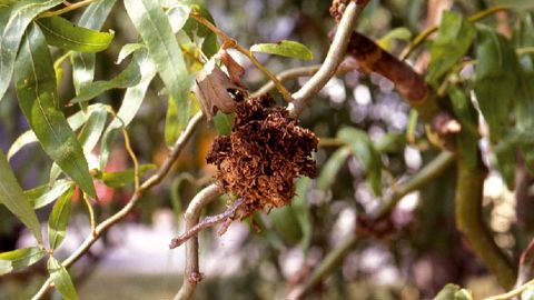 Pousses fortement déformées par Eriophyes triradiatus générant un amas de tissus desséchés persistant dans le houppier.