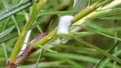 « Crachat de coucou » ou amas spumeux recouvrant la larve de l'aphrophore du saule (Aphrophora salicis).