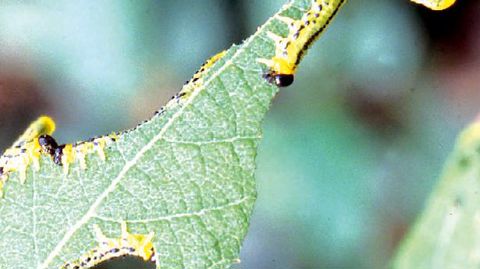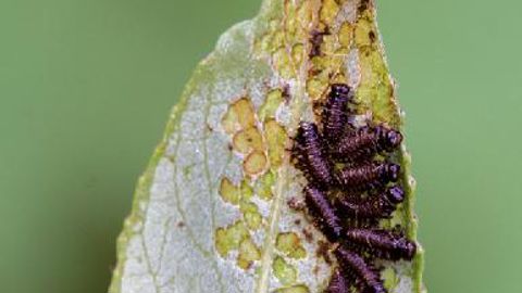 Larves noires de la petite chrysomèle des saules (Plagiodera versicolara) décapant le limbe foliaire sur sa face inférieure.