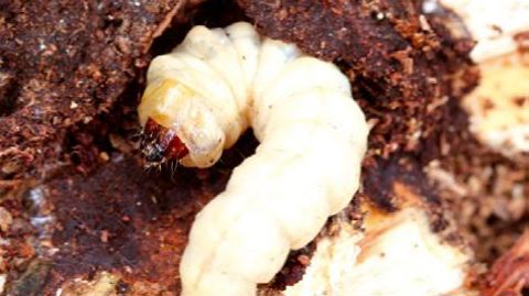 Chenille de la sésie apiforme (Sesia apiformis) dans sa galerie sous-corticale lors de sa remontée au collet de l'arbre.