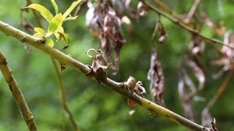 Petits chancres noirs (Glomerella cingulata) sur de jeunes rameaux entraînant des dessèchements de pousses printanières.
