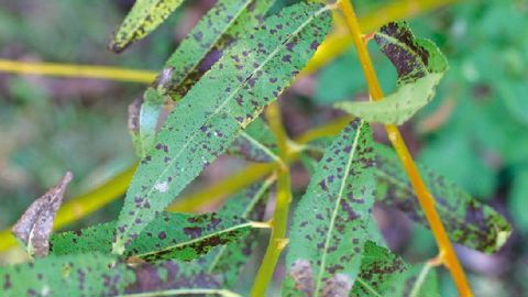 Taches sombres d'origine cryptogamique (Drepanopeziza salicis) sur des feuilles de Salix.