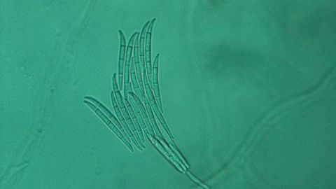 Spores (macroconidies) de Fusarium oxysporum f. sp. cyclaminis. ASTREDHOR