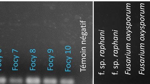 Test indiquant la présence (bande blanche) ou l'absence du morceau d'ADN spécifique de Focy (absence de bande blanche) chez différents microorganismes. Les noms notés en bleu correspondent à différentes souches de Focy. Les témoins négatifs correspondent à un traitement à l'eau stérile. Les autres noms correspondent à d'autres formes spéciales de F. oxysporum (f. sp. raphani pathogène du radis et f. sp. cubense pathogène du bananier) et d'autres espèces appartenant au genre Fusarium. ASTREDHOR