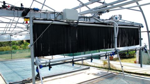 La thigmomorphogenèse a fait ses preuves sur le terrain. Le chariot aérien devient un outil polyvalent permettant l'irrigation, la fertilisation, les traitements phytosanitaires, la stimulation mécanique, le piégeage des ravageurs... PHOTO : VALERIE VIDRIL