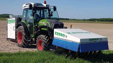 Electroherb, développé par Zasso, est composé d'un groupe électrogène qui génère un courant de 5 000 à 15 000 volts et qui alimente deux plaques qui détruisent électriquement les adventices à l'avant du tracteur. PHOTO : ZASSO