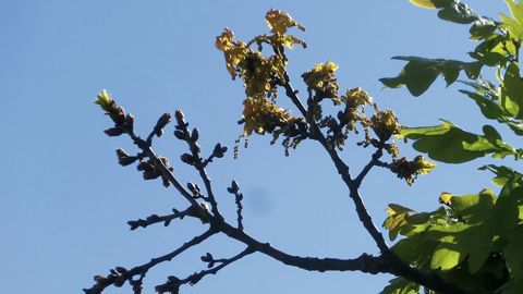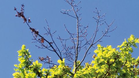 Des rameaux dénudés en hauteurDes axes isolés dans le houppier se dessèchent. Au moment du débourrement printanier, ils n'émettent pas de feuilles alors qu'ils étaient parfaitement en végétation lors de la saison précédente. Ces rameaux impactés - de faible importance généralement et d'une longueur dépassant rarement 1,50 m - sont situés à la périphérie de la couronne et plutôt en hauteur.