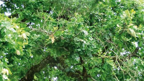 Dessèchements de branchesUn vieux chêne pédonculé (Quercus robur) d'origine spontanée se trouve inclus dans un aménagement urbain au centre d'un îlot végétalisé. Son port trapu, son large houppier et son tronc imposant lui confèrent un statut d'arbre remarquable ; il marque fortement le paysage. Le sujet assez peu vigoureux ne présente aucun signe marqué de dépérissement. Pourtant, des dessèchements de branches apparaissent régulièrement et suscitent l'inquiétude des riverains...