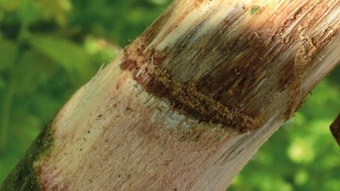 Rupture de branche au niveau de la galerieSi l'on tire énergiquement sur ces branches récemment desséchées, elles se rompent facilement au niveau de cette galerie circulaire. PHOTOS PIERRE AVERSENQ