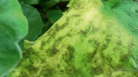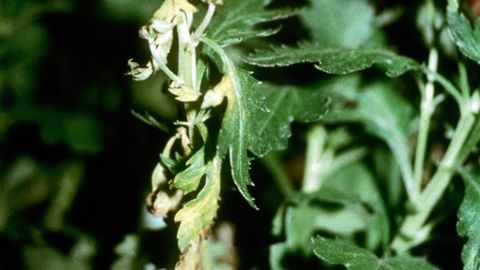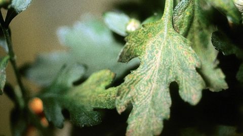 Arabesques sur feuille de chrysantème dues au TSWV. PHOTO : SRAL DES PAYS DE LA LOIRE