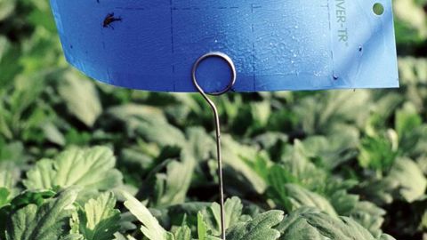 Plaque bleue engluée en culture de chrysanthème pour piéger les thrips. PHOTO : JÉRÔME JULLIEN