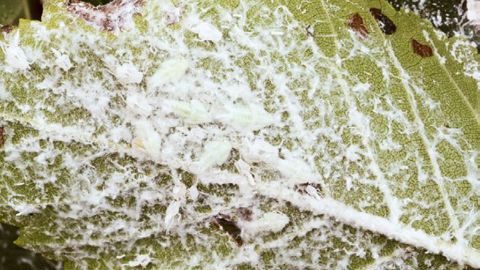 Le flatide pruineux développe au revers des feuilles des amas de filaments blancs cotonneux au sein desquels séjournent les larves.