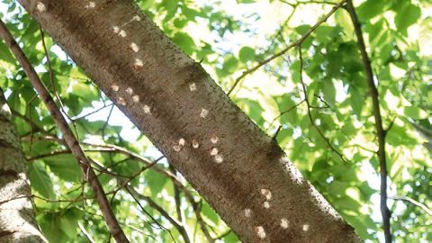 La cochenille pulvinaire du marronnier (Pulvinaria regalis) dépose ses ovisacs sur les branches et les charpentières lors de la ponte.