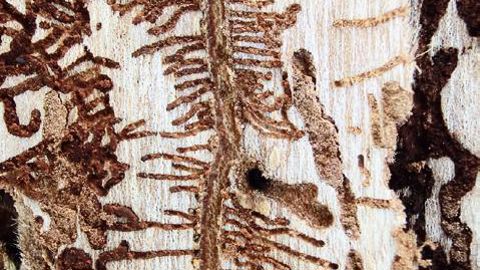 Galeries caractéristiques de scolytes dans la zone sous-corticale.