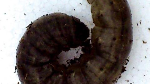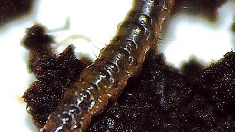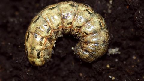 Agrotis exclamationis prélevé sur cyclamen. Dérangés, les vers gris se lovent de façon caractéristique. PHOTO : ASTREDHOR