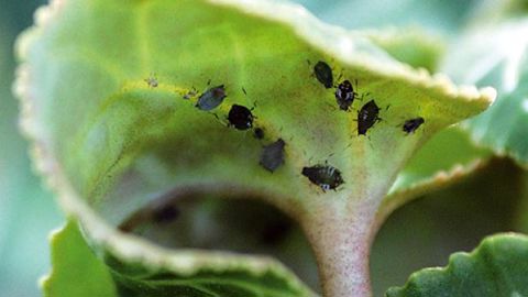 Colonie de pucerons sur cyclamen. Ils provoquent l'enroulement des feuilles. PHOTO : JÉROME JULLIEN