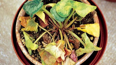 Les symptômes de la fusariose vasculaire du cyclamen, Fusarium oxysporum f. sp. cyclaminis, s'expriment surtout après l'empotage. PHOTO : JÉROME JULLIEN
