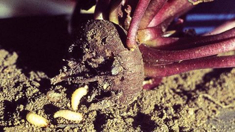 Quelques insectes infestent le système racinaire. L'otiorhynque de la vigne et du cyclamen (Otiorhynchus sulcatus) est un coléoptère de la famille des charançons. La larve blanchâtre à tête brune, apode, est rhizophage. Sa voracité augmente au fur et à mesure de son développement. Elle sévit de juillet à mars. Traiter les jeunes larves avec des nématodes entomopathogènes. Certains papillons nocturnes pondent principalement dans les endroits humides. Leurs larves polyphages sont très actives en serre. Distinguer les chenilles de noctuelle (Agrotis sp., Noctua pronuba) des larves de Duponchelia fovealis. Les vers gris de noctuelle rongent le tubercule, le collet et parfois les pétioles au cours de la nuit. Pendant le jour, ils se dissimulent. Dérangés, ils se lovent de façon caractéristique. Les chenilles de D. fovealis forent le dessus du tubercule et les tiges. Examiner les jeunes plants dès leur arrivée dans l'entreprise. Puis, surveiller les cultures grâce au piégeage phéromonal. Dix jours après les premières captures ou dès l'observation des dégâts, appliquer du Bacillus thuringiensis ou des nématodes entomopathogènes Steinernema carpocapsae. Il est possible d'apporter l'acarien Hypoaspis aculeifer, prédateur d'oeufs, en complément. En lutte chimique, pulvériser un produit systémique contenant du thiaméthoxam ou du thiaclopride.