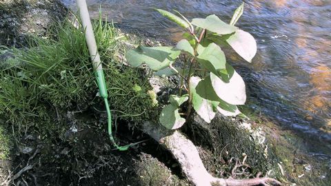 3. COMME POUR TOUTES LES INVASIVES, IL FAUT AGIR TÔT. L'arrachage précoce consiste à prélever, manuellement à l'aide d'une pioche, les rhizomes disséminés par les terrassements ou les crues, avant qu'ils s'enracinent. L'opération doit impérativement se faire au printemps sur un sol humide quand les tiges commencent juste à sortir, ce qui permet de localiser ces racines. Plus tard en saison, il sera très difficile de les retirer sans les fragmenter. Il est important de vérifier que les extrémités du rhizome extrait ne présentent pas de blessure fraîche indiquant alors qu'il en reste un morceau dans le sol (susceptible de reformer rapidement une nouvelle plante) et d'évacuer les plantules arrachées. En bordure de cours d'eau, il convient de parcourir chaque année toutes les berges en aval des foyers existants sur plusieurs kilomètres, ce qui peut être fastidieux, mais l'arrachage précoce représente la méthode la plus efficace et la moins coûteuse pour limiter la progression des renouées.