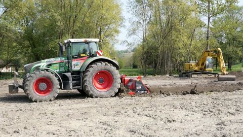 La technique de concassage agit directement sur les rhizomes en provoquant des blessures pour les faire pourrir. Le broyeur à pierre est utilisé avec l'appui d'un engin de terrassement qui prépare les couches de terre à broyer pour traiter de gros volumes. PHOTO : BOYER M., CONCEPT COURS D'EAU, SCOP