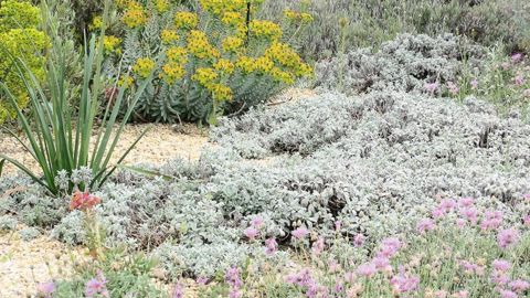 Au centre, à l'arrière du tapis de Centaurea bella, la tanaisie dense, Tanacetum densum subsp. amanii, offre un feuillage persistant blanc argenté aromatique. Résistance au froid : - 15 °C, code sécheresse 4.