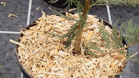 « Le réseau Astredhor expérimente le miscanthus en paillage depuis 2009 (essais Sileban, CDHR Centre, Arexhor Grand Est et Cate) », a rappelé Olivier Gros, conseiller technique de la station Ratho, lors de la journée du 28 novembre. Une bonne efficacité requiert 3 à 5 cm d'épaisseur minimum. En massif par exemple, une balle de paillis compressé de 25 kg (100 l, et 250 l défoisonné) permet de recouvrir 5-6 m² pour une épaisseur de 5-7 cm. Miscanthus x giganteus en copeaux de 10 à 20 mm offre une faible volatilité, une fois arrosé. Par ailleurs, étant stérile, il n'y a pas de risque de germination, contrairement aux pailles de lin et aux cosses de sarrasin. C'est d'ailleurs suite à une mauvaise expérience de ce genre que Damien Vivier, pépiniériste à Penol (38), a décidé de tester le paillage de miscanthus en 2013, en collaboration avec un voisin agriculteur, Laurent Point. Ce dernier s'est diversifié dans la production de biomasse. Les résultats semblent prometteurs malgré un printemps pluvieux favorable aux adventices ; une deuxième année d'essai est nécessaire. En 2014, Damien Vivier va essayer un calibre plus fin pour faciliter l'amalgame des copeaux, et surveiller particulièrement l'arrosage pour éviter la dégradation trop rapide du paillis.