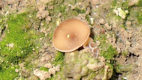 Sclerotinia sclerotiorum. À la faveur de la chaleur humide sous abri, les nodules noirs de Sclerotinia sclerotiorum germent à la surface du substrat sous la forme de champignons de 4 mm semblables à une coupe évasée appelés pézizes ou apothécies.