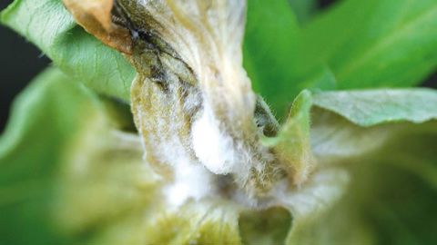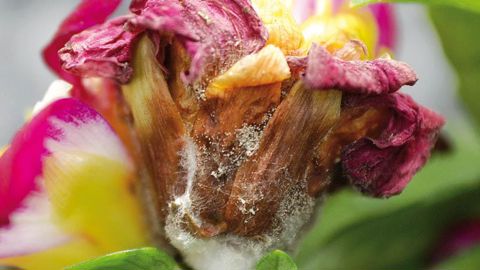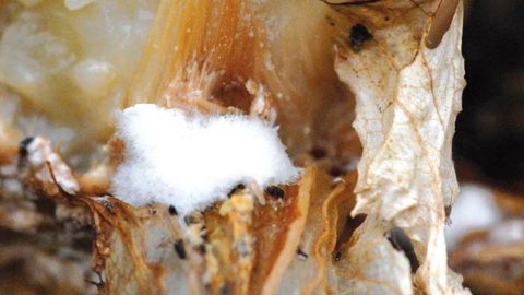 Dans notre cas, le substrat à base de compost est à l'origine de l'inoculum primaire. L'horticulteur a testé l'incorporation de compost de déchets verts recyclés dans le substrat horticole de plantes à massif en godets. Des sclérotes ont apparemment résisté au processus de fermentation et de décomposition des matières organiques. Le confinement de végétation a ensuite favorisé les contaminations des parties aériennes. Les corpuscules noirs, souvent très durs, qui se trouvent dans les tissus pourris sont des sclérotes (1), organes de conservation de la sclérotiniose. Cette affection connue en France depuis 1837 est due au champignon parasite Sclerotinia sclerotiorum de l'ordre des Hélotiales dans la classification des Ascomycètes. Il est assez rare que cette maladie se généralise à l'ensemble d'une culture florale, grâce à la production hors-sol, à la subirrigation et à une hygiène régulière de la serre. En revanche, elle est potentiellement plus fréquente dans des tunnels plastique en mode de production traditionnel où les plantes à massif sont exposées aux projections de spores à proximité du sol. La polyphagie du Sclerotinia (2), la variété de son habitat et son haut pouvoir contaminant sont redoutables dès les stades juvéniles des cultures florales. Certaines espèces, comme le chrysanthème, peuvent subir une infection de Sclerotinia minor, mais dans ce cas les sclérotes sont d'un diamètre plus petit (1-2 mm) que ceux de Sclerotinia sclerotiorum (2,5-10 mm). De plus, le mycélium blanc est plutôt moins abondant chez Sclerotinia minor.