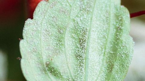 Le duvet blanc grisâtre à la face inférieure des feuilles d'Impatiens walleriana correspond au développement des sporangiophores qui produiront soit des sporanges et leurs zoospores (issues de la reproduction asexuée) en conditions favorables, soit des oospores (reproduction sexuée) en conditions défavorables. PHOTO : JÉRÔME JULLIEN